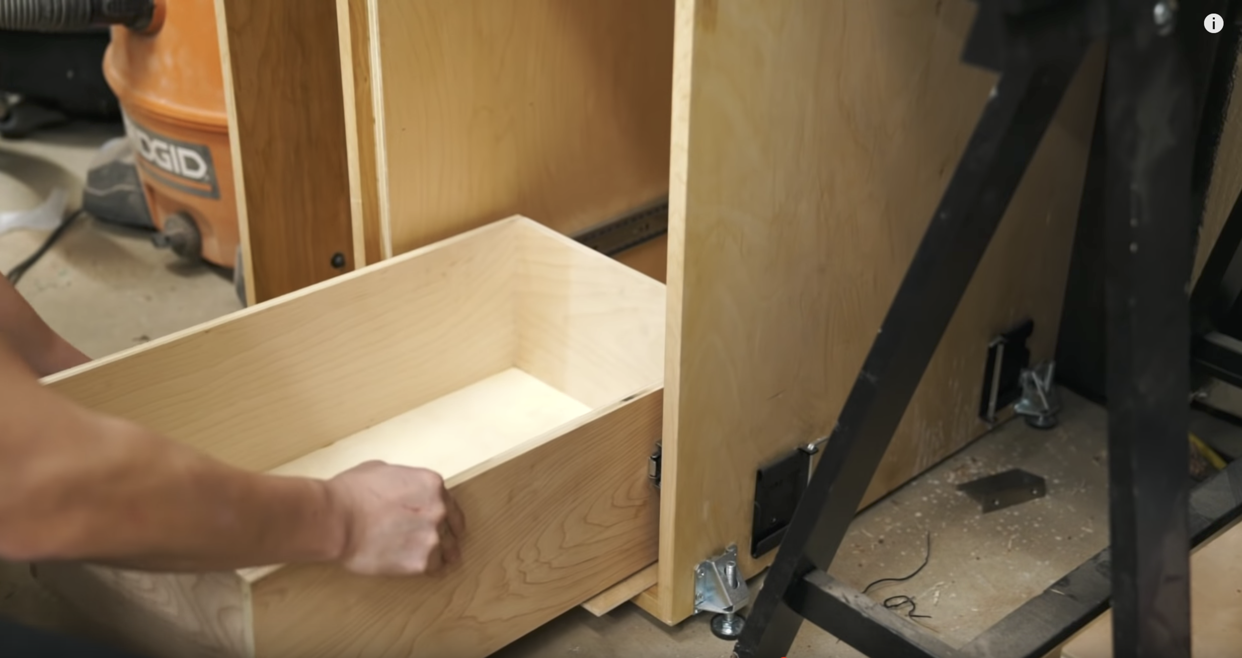 To install the drawer slides, I used a piece of 1/4β plywood as a spacer to lift up the bottom drawer box. Then I pulled the slides out with the box in order to fasten two screws to either side. Then finally pulling the drawer box out with the drawer slides to fasten the 3rd screw to either side.
