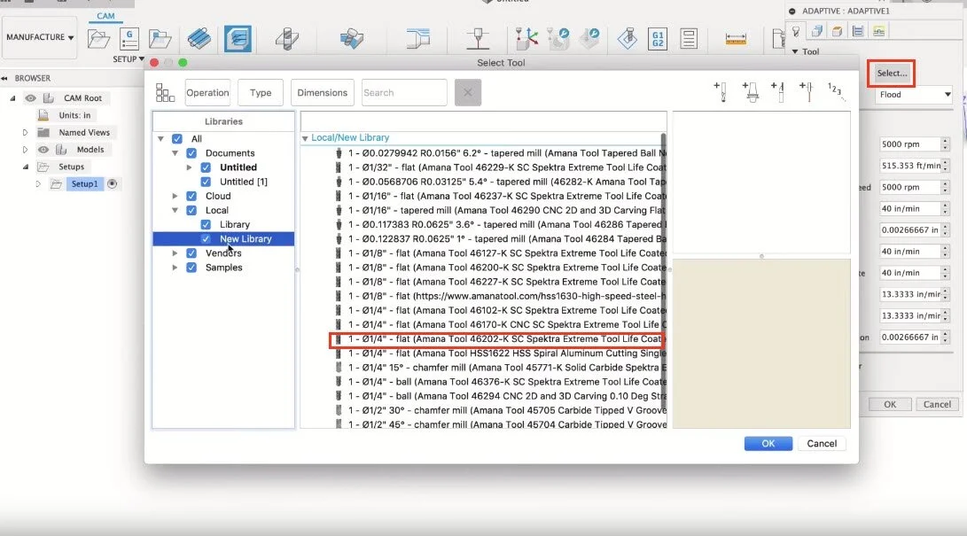 For the first cut, we'll use an "Adaptive Clearing" under the "3D" drop-down menu. The 3D Adaptive Clearing operation will efficiently allow our machine to clear out the bulk of the material. First, we'll define the tool for the operation. For me, I chose a 1/4" flat end mill. I covered in the video how to find all the information you'll need for different cutter bits. Since nobody has the exact same bits, I won't cover that step in this Instructables.